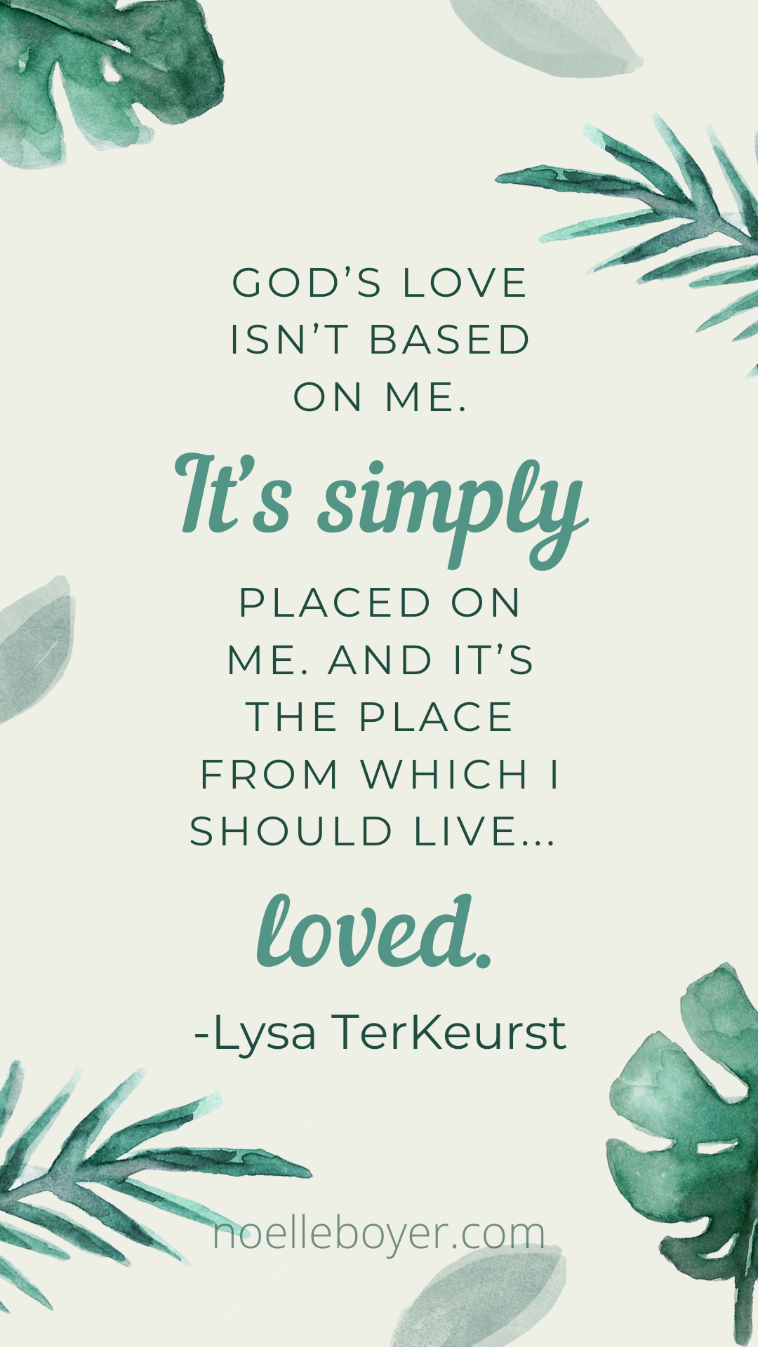 So how do we actively live loved? This chapter is one, I will revisit often. The goal is to accept that “God’s love isn’t based on me. It’s simply placed on me. And it’s the place from which I should live..loved.”