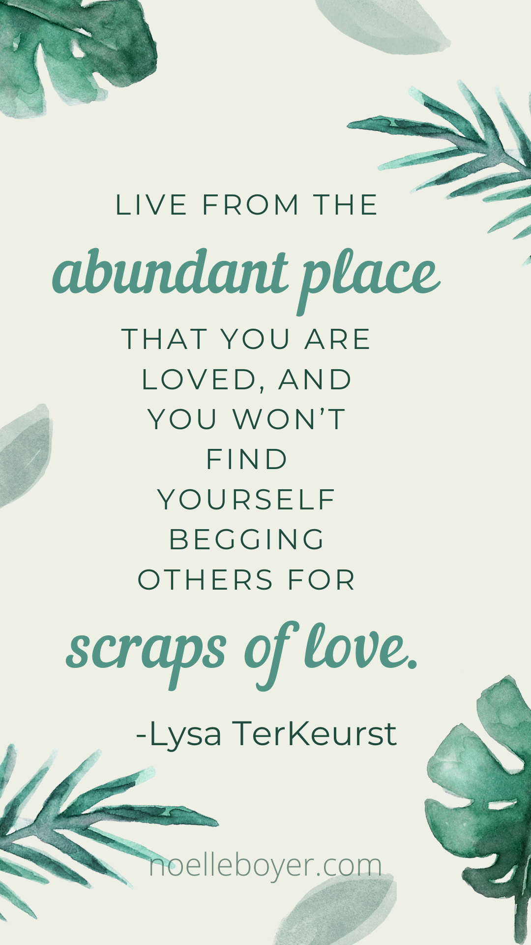 She goes on to challenge us to “Live Loved” so we stop living as “a slave to my runaway emotions and assumptions.” Meaning “live from the abundant place that you are loved, and you won’t find yourself begging others for scraps of love.”